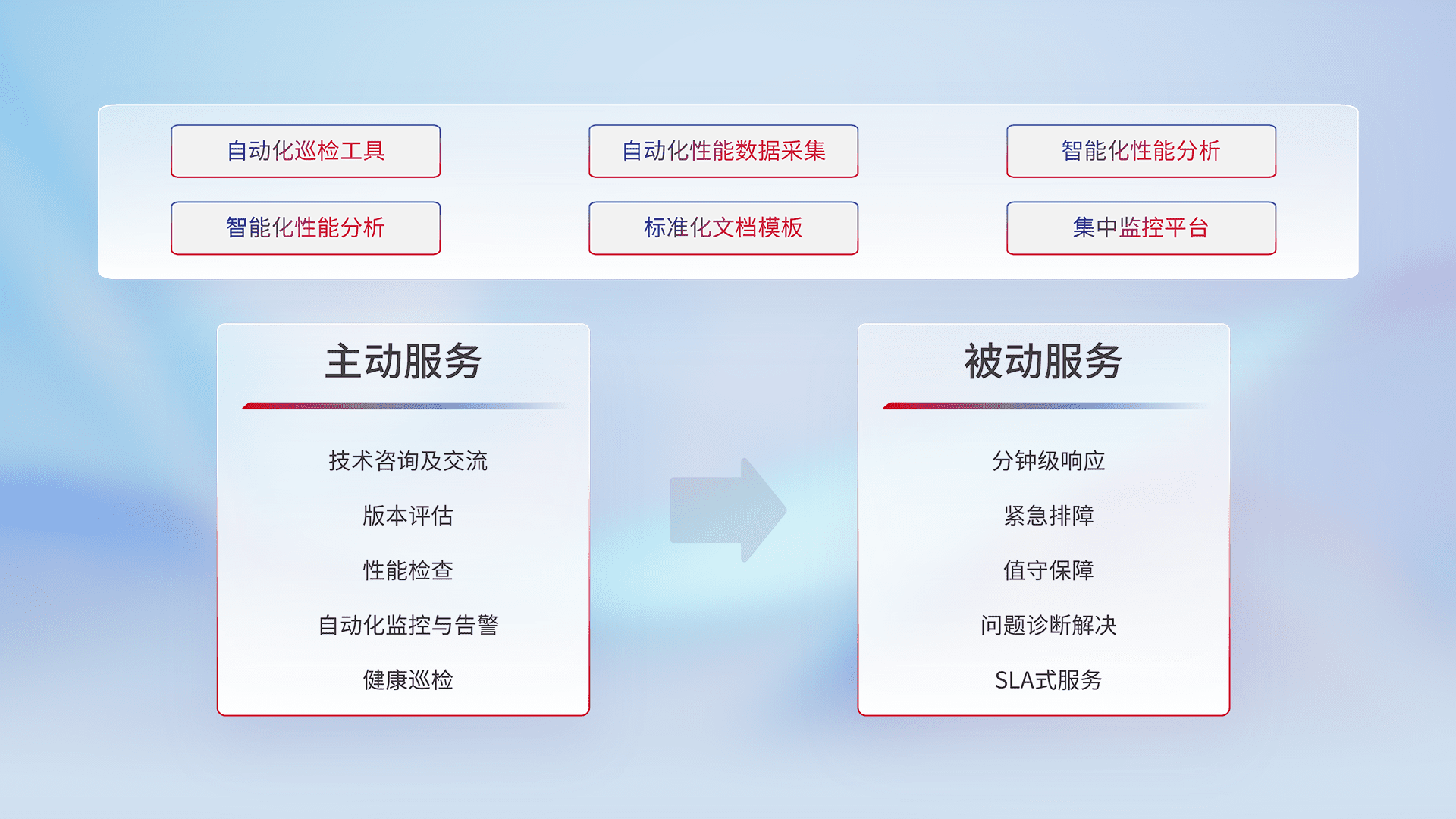 智能化工具和标准化文档,,,保障服务质量,,,,提供主动服务(包含技术咨询、、版本评估、、、、性能检查、、、自动化监控与告警、、、、健康巡检)和被动服务包含(分钟级响应、、、、紧急排障、、、值守保障、、、问题诊断解决、、、、SLA服务)。。。。