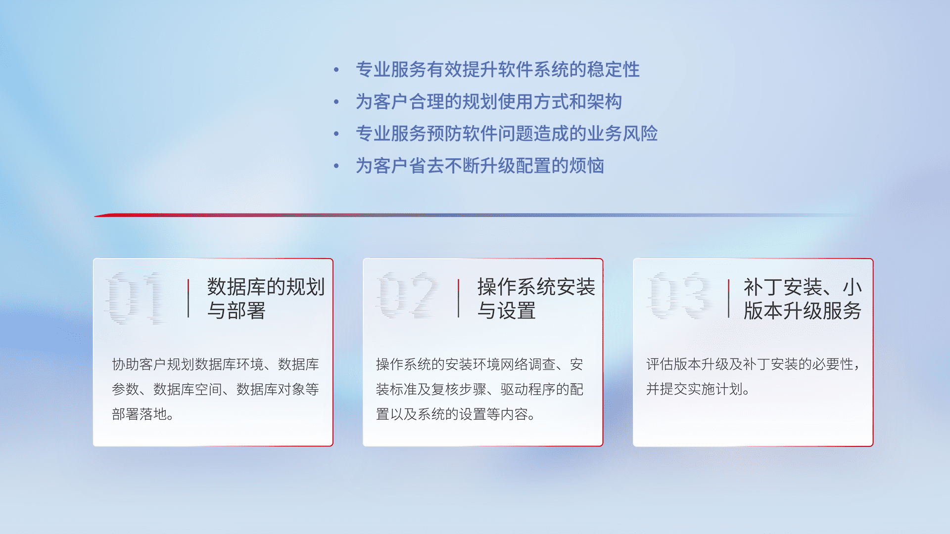 为客户提供软件规模升级、、、快速部署、、按需配置的专业服务,,,从数据库的规划与部署到操作系统的安装与设置,,,,再到补丁安装和小版本升级提供支持。。